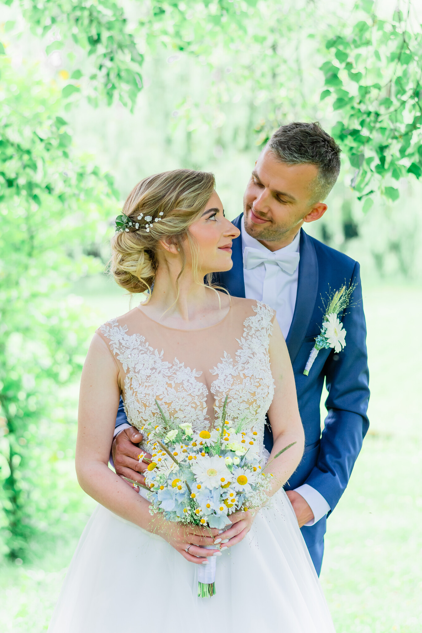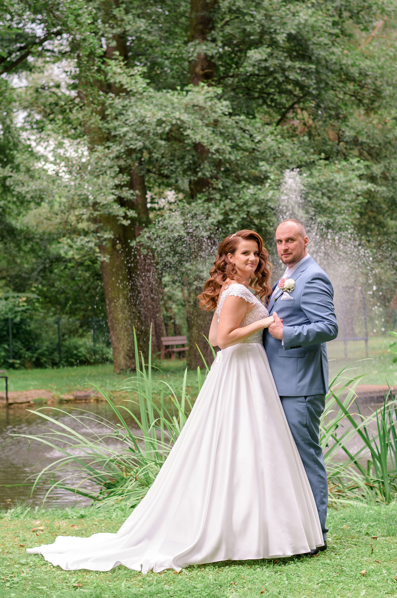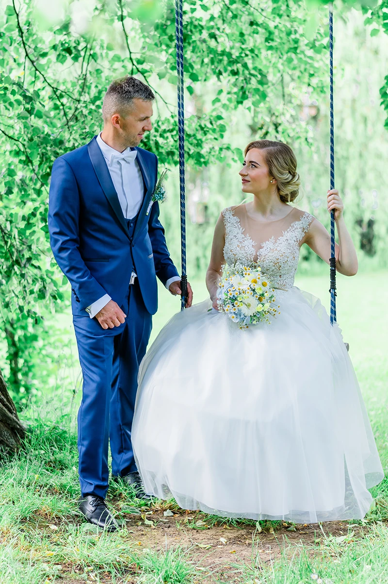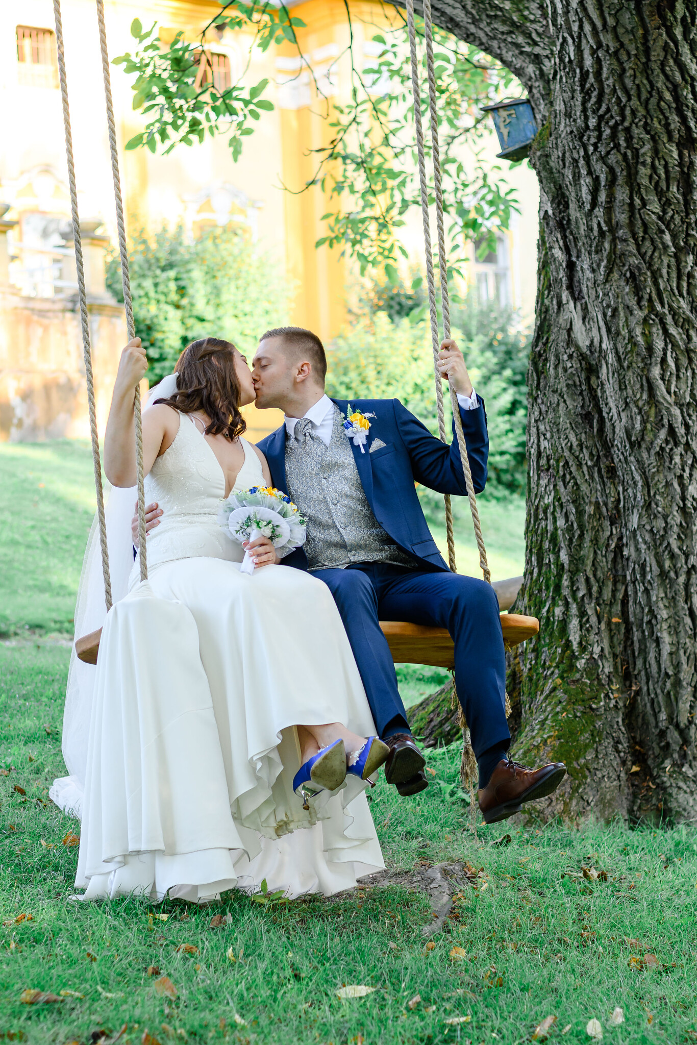 Vďaka stromom vzniká prirodzený tieň a mäkké svetlo, ktoré lichotí portrétom počas celého dňa. Veľkou výhodou je aj dostupnosť – nemusíte nikam cestovať a fotenie zvládnete rýchlo aj počas svadobného dňa.